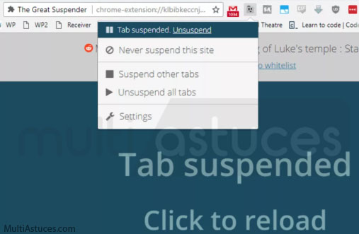 Si vous ouvrez beaucoup d’onglets sur votre navigateur Chrome, alors vous avez probablement réalisé le problème quand il commence à accaparer beaucoup de ressources informatiques, ce qui entraîne une panne du système. Si vous rencontrez ce problème sur votre ordinateur, vous n’avez plus besoin de vous en préoccuper. Vous pouvez utiliser la grande extension de chrome de suspension qui vous permet d’ouvrir autant d’onglets que possible. Il suspend automatiquement un onglet après un délai prescrit de non-utilisation. Cette extension vous permet également de créer une liste blanche pour les sites Web que vous ne souhaitez jamais voir suspendus.